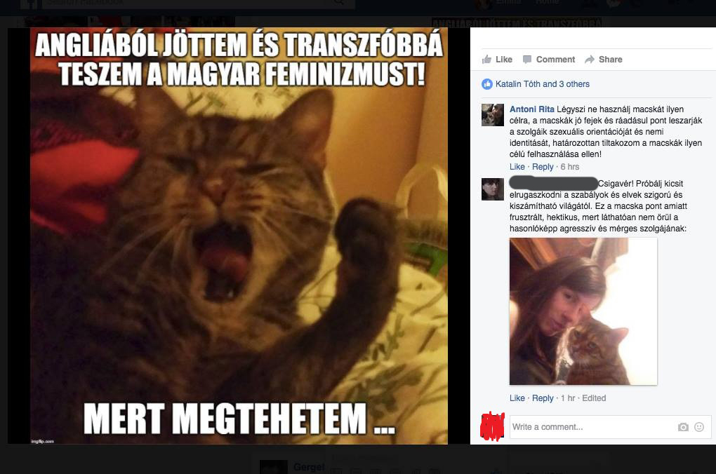 Nem vagyok én királykisasszony. Akit lehet szarral dobálni lábtörlőnek hívják. Ugyanaz a műsor mint mindig: nagy pöffeszkedve emlékezetet ara nem vagyok én királykisasszony (képzeljek kevesebbet magamról), aztán az ujját csóválva akar bűntudatot kelteni, elszámoltatni. Hatalmaskodik ahogy mindig az összes: bűnlajstromoznak, számonkérnek, elítélnek, végrehajtást követelnek, közben ferdítenek és csúsztatnak. Például a fejemre olvassa, mint én akarnám 'legyőzni' ezt a szerencsétlent akiről azt se tudtam kicsoda mielőtt rámszállt, hogy nem engem szakított félbe- az én megnyitóm, az én mocskolásommal, és egyébként engem is. Miután egyébként PRK nyilvánosan ellenem fordult, vagyis a legalja módon szúrt nyilvánosan hátba. Ez volt a trigger a 'transzleszbikusnak'. Persze mit számít mindez, az számít, hogy Patakfalvi élvezkedhessen a balhén. Olyan szerepeket vesznek fel amik feljogosítják őket valamire (áldozat, igazságosztó) és akit ők üldöznek az már el van ítélve, már morálisan rossz- szabad préda. Minden mondatuk játszma, és mindent becsomagolnak. Annyira akar egy szeletet a tortából, annyira akarja, hogy egy nála szabadabb, erősebb, öntudatosabb ember akaratát megtörhesse. Ezek jogilag nyilvánosnak számító screenshotok, tehát nem kell anonimizálnom. Ha nyilvánosan tört rájuk akkor maradjon is az egész nyilvános.